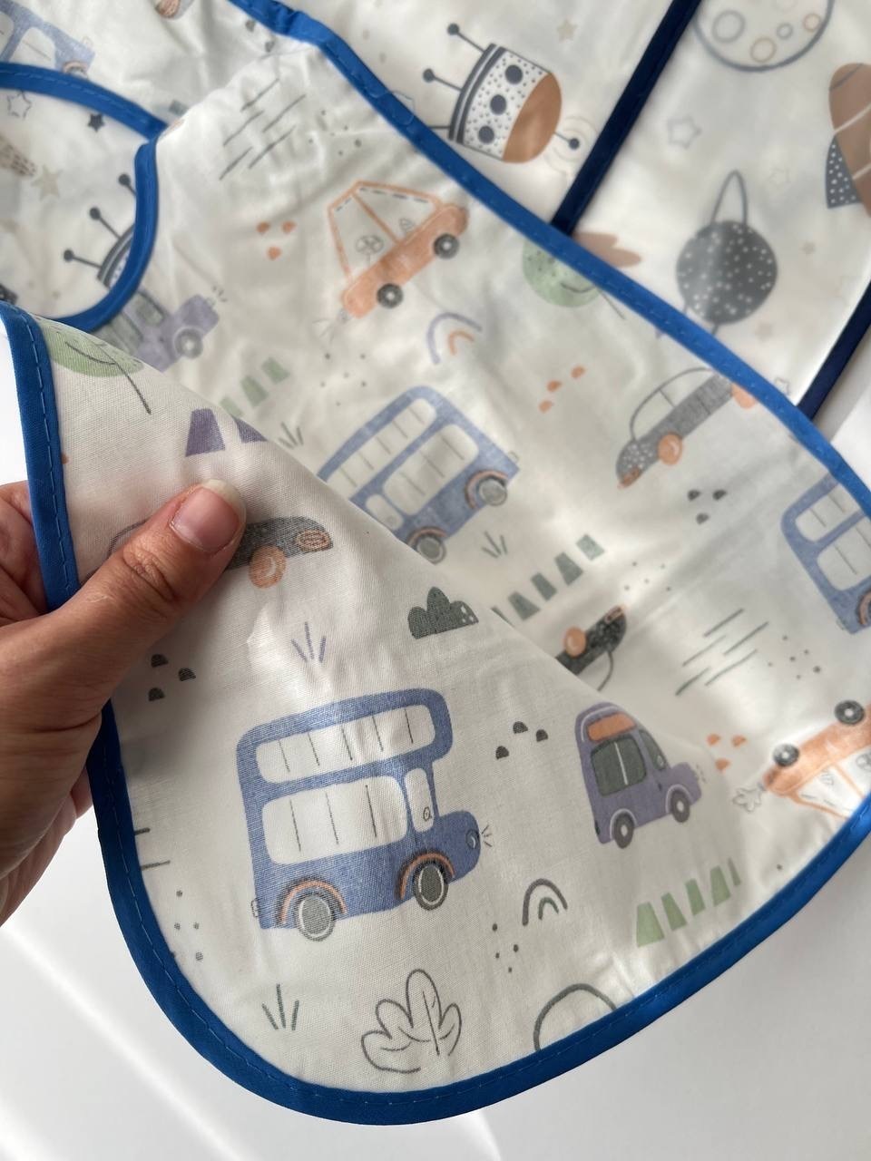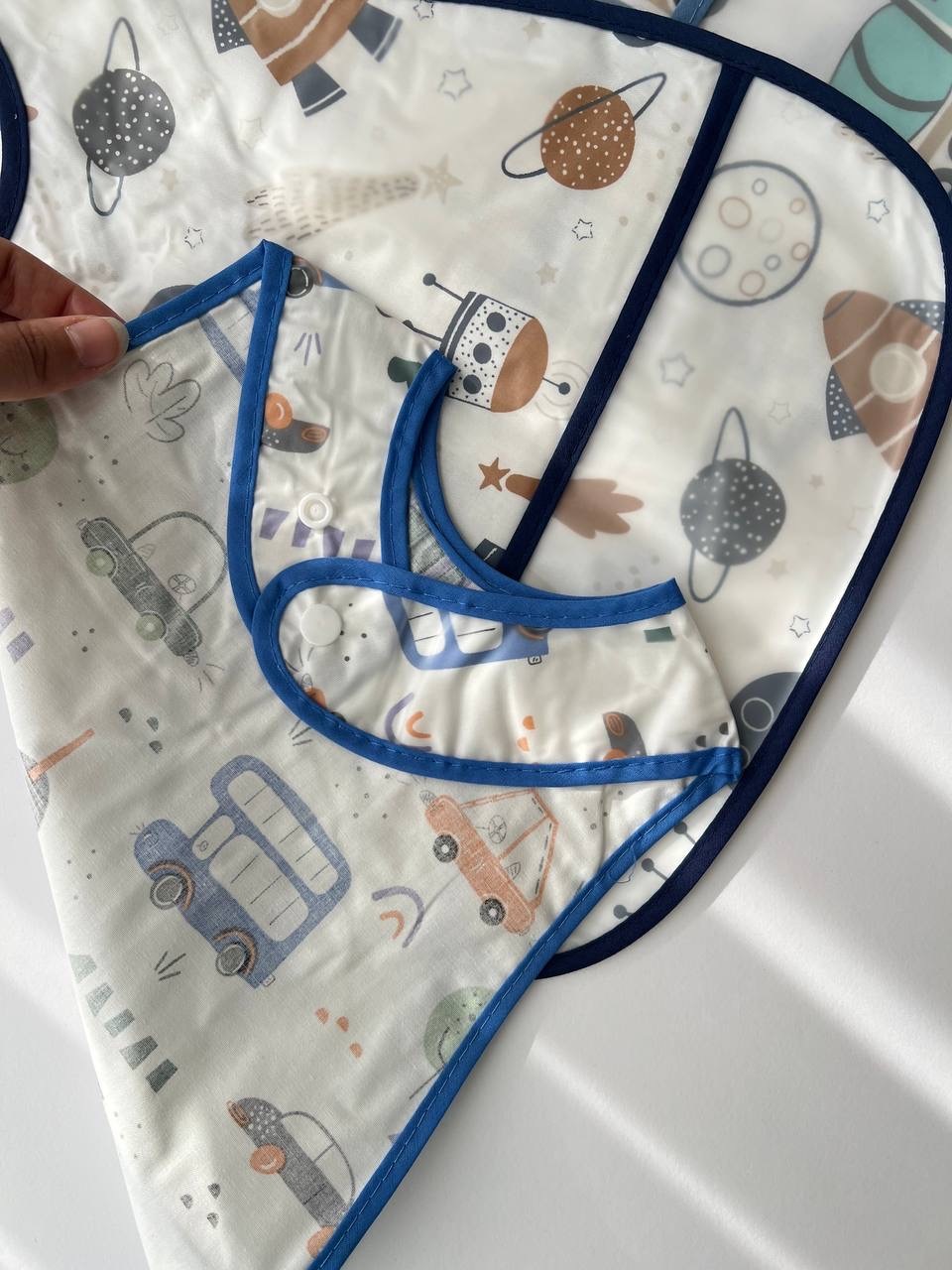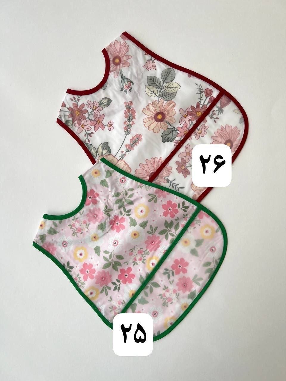 پیشبند دو لایه ، یک لایه پارچه و یک لایه حالت پلاستیکی سفره ای ضد آب؛ مناسب تایم غذا ، با قد حدود 30 سانت ، و دارای دو دکمه برای تنظیم سایز دور گردن؛ دارای مخزن پایین پیشبند برای جمع آوری غذا