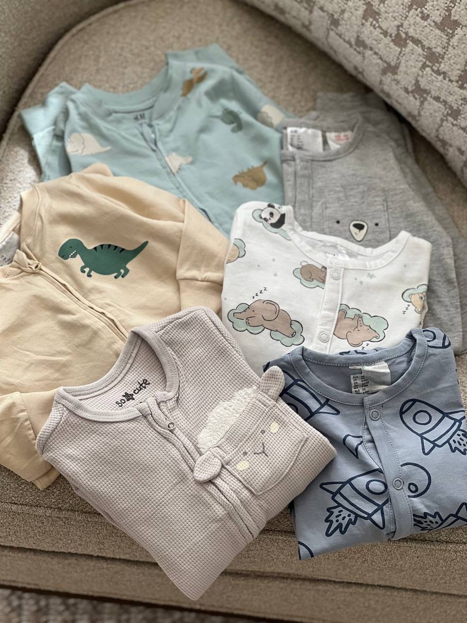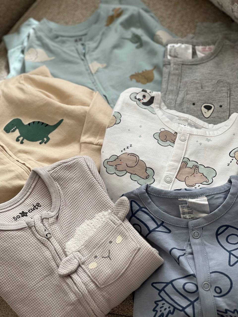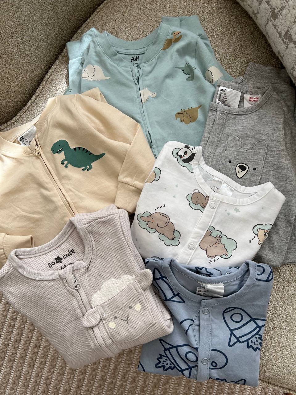 H&M : سبزآبی کروکدیل و دایناسور، سفید حیوانات خوابالو، طوسی جیب خرسی، آبی موشک، گندمی دایناسور سبز